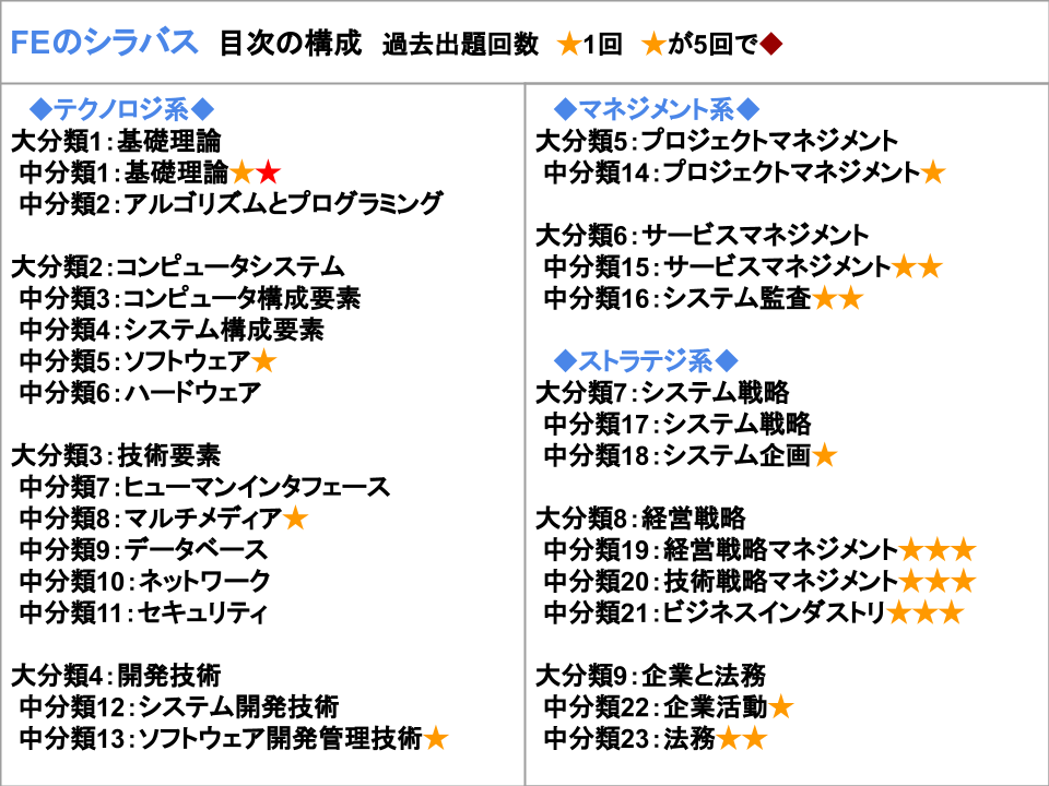 ▼今回の問いとFEのシラバスの関連を赤の★印、既出は橙色の★印で示しました。