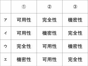 ▼令和2年度:【テクノロジ系】問94 IoTデバイス群とそれらを管理するIoTサーバで構成されるIoTシステムがある。このシステムの情報セキュリティにおける①~③のインシデントと、それによって損なわれる、機密性、完全性及び可用性との組合せとして、適切なものはどれか。