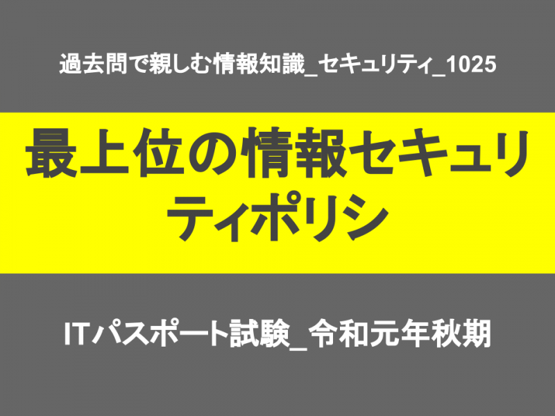 ▼令和元年秋期:【テクノロジ系】問84 内外に宣言する最上位の情報セキュリティポリシに記載することとして、最も適切なものはどれか。 ア 経営陣が情報セキュリティに取り組む姿勢 イ 情報資産を守るための具体的で詳細な手順 …