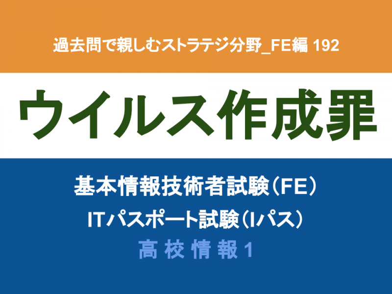 ▼平成30年度秋期:問78 コンピュータウイルスを作成する行為を処罰の対象とする法律はどれか。 ア 刑法 イ 不正アクセス禁止法 ウ 不正競争防止法 エ プロバイダ責任制限法 ▼上に出てきた用語の意味 【不正アクセス禁止 …