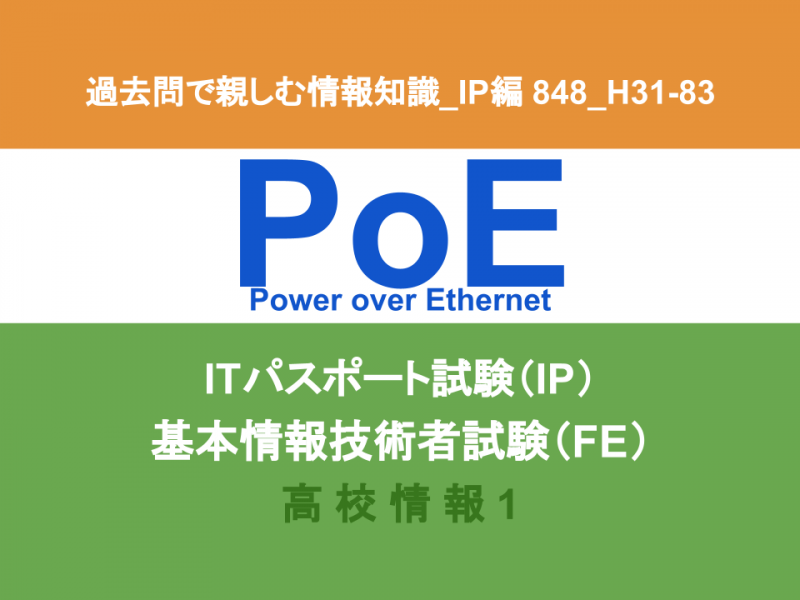 ▼平成31年度 春期分:【テクノロジ系】問83 PoEの説明として、適切なものはどれか。 ア LANケーブルを使って電力供給する技術であり、電源コンセントがない場所に無線LANのアクセスポイントを設置する場合などで利用さ …